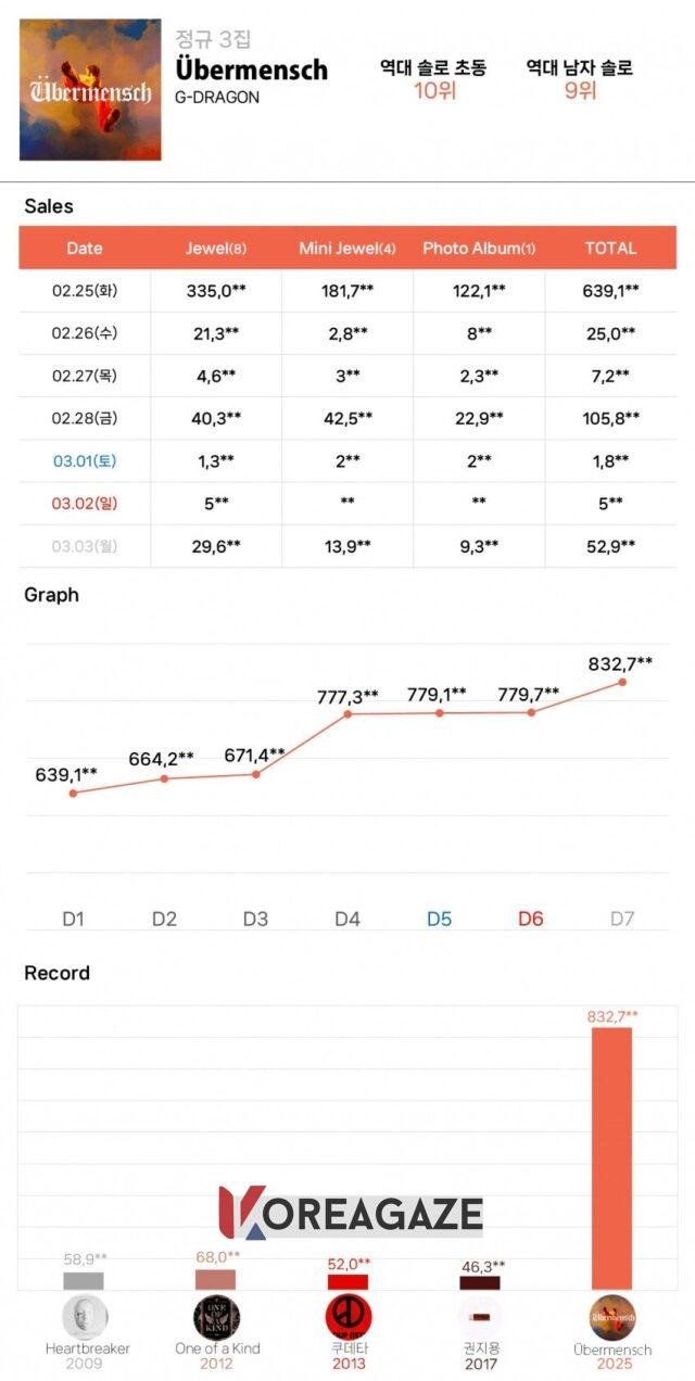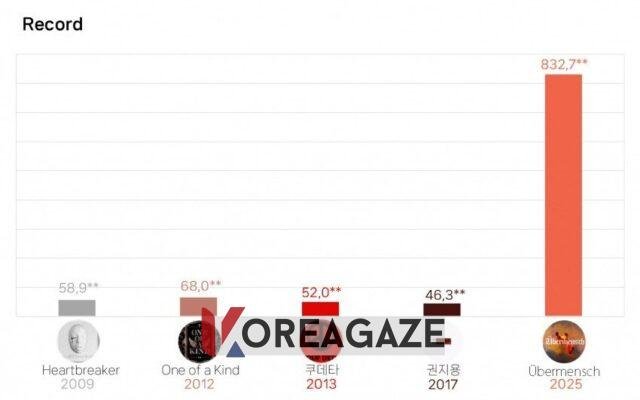 با توجه به این وقفه طولانی، بیصبرانه منتظر برگشت جی دراگون بودیم. اما آمار فروش آلبوم جدیدش، “Übermensch”، همه رو شگفتزده کرده! طبق گزارش Hanteo، مجموع فروش هفته اول این آلبوم بیشتر از ۸۳۲,۷۰۰ نسخه بوده که اوج موفقیت جی دراگون به عنوان یک هنرمند سولو محسوب میشه.