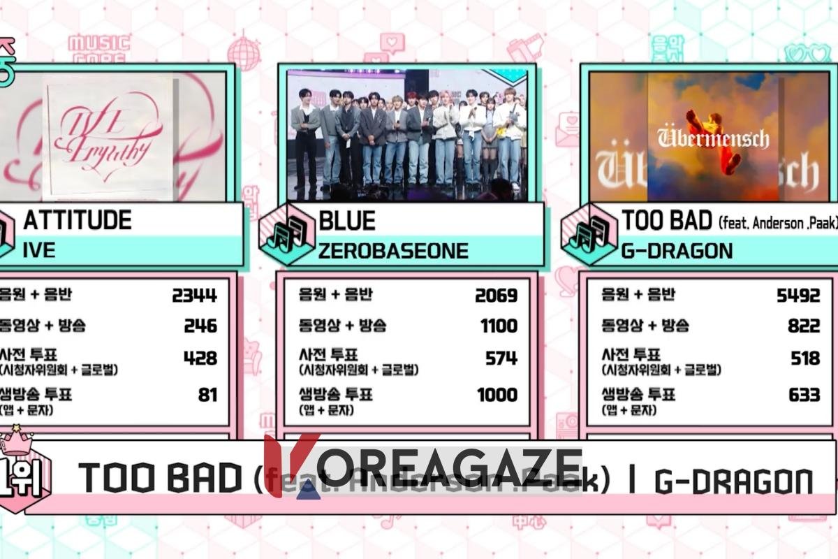 در قسمت 8 مارس “Music Core” (موزیک کور) از MBC، نامزدهای رتبه اول آهنگ “ATTITUDE” (اَتیتود) از IVE، آهنگ “BLUE” (بلو) از ZEROBASEONE (زیرو بیس وان) و آهنگ “TOO BAD” (خیلی بد) از جی دراگون (G-Dragon) بودند. در نهایت، جی دراگون با مجموع 7,465 امتیاز برنده شد.
