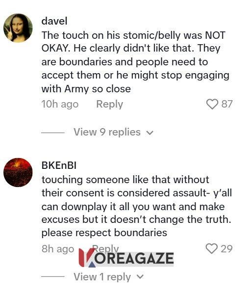 در این ویدئو، در حالی که طرفداران برای لمس دستان جی هوپ دراز میکردند، یک طرفدار دیده میشود که به سمت شکم او رفته و برای چند ثانیه آن را لمس میکند و حتی دستش را به سمت پایین حرکت میدهد.