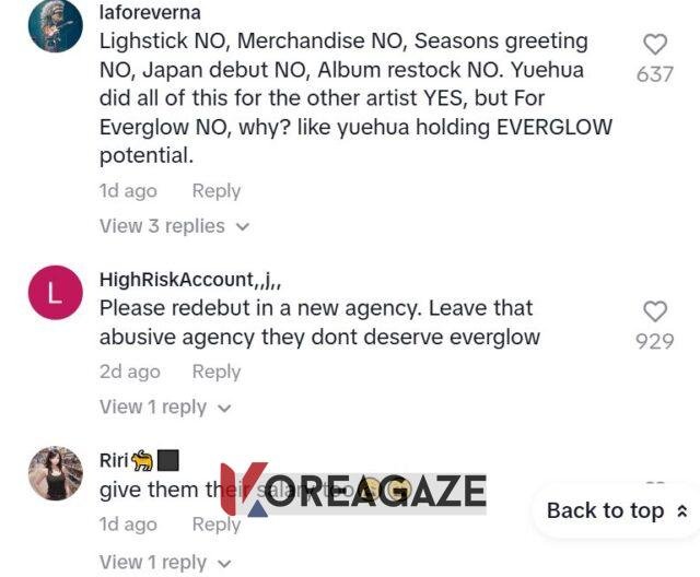 اخیراً، گروه EVERGLOW پس از آن که یرن (Yiren) (عضو گروه) فاش کرد هرگز دستمزدی دریافت نکرده، به موضوع داغ رسانهها تبدیل شد. کاربران اینترنتی همیشه فکر میکردند که با EVERGLOW از زمان شروع فعالیتشان بدرفتاری شده است، از جمله کمبود بازگشتها، فعالیتها و حتی نداشتن لایتاستیک با وجود شروع به کار در سال 2016.