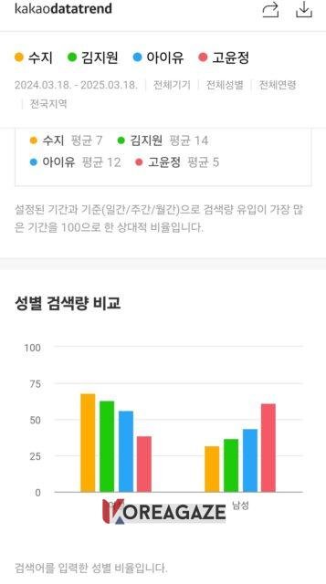 با این حال، جوامع مردانه در واقع ترتیب معکوس را ترجیح می‌دهند: گو یون جونگ پیشتاز است و پس از او آیو، کیم جی وون و سوزی قرار دارند.