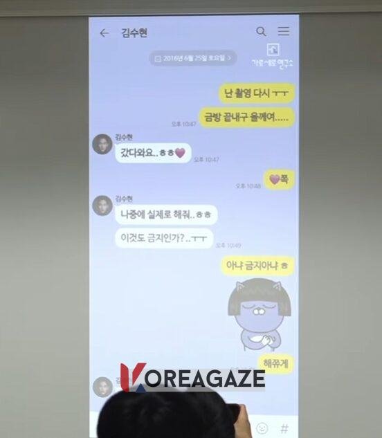 در بین این چتها، پیامهای رسواکنندهای وجود داشت که نشان میداد کیم سو هیون در تلاش بوده تا صمیمیت فیزیکی با این ستاره که در آن زمان نوجوان بوده، برقرار کند.