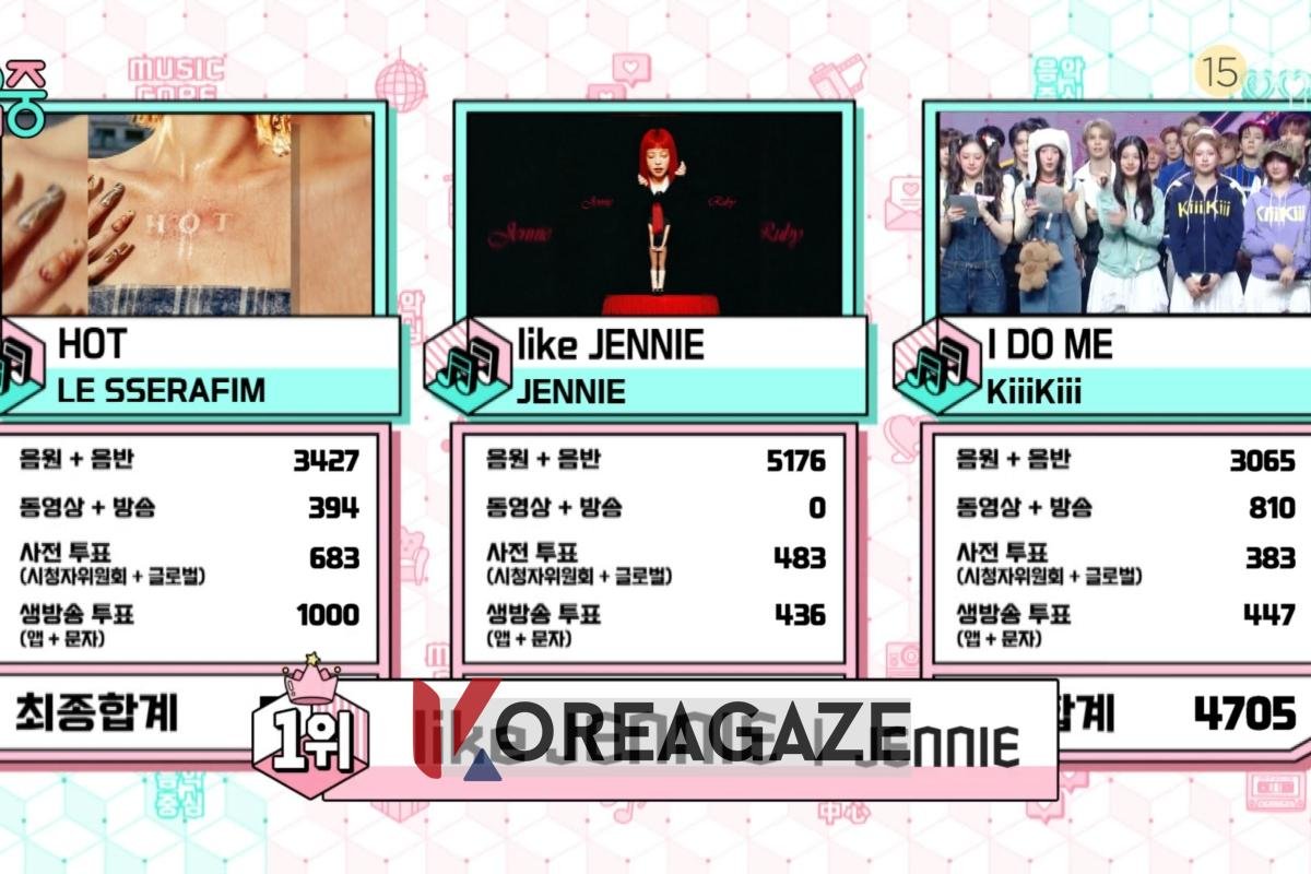 در قسمت 12 آوریل “Music Core” (موزیک کور) از MBC، نامزدهای رتبه اول آهنگ “HOT” از LE SSERAFIM (لسرافیم)، آهنگ “like JENNIE” از جنی (Jennie) از BLACKPINK (بلک پینک) و آهنگ “I DO ME” از KiiiKiii (کیییکییی) بودند. در نهایت، جنی با مجموع 6095 امتیاز برنده شد.