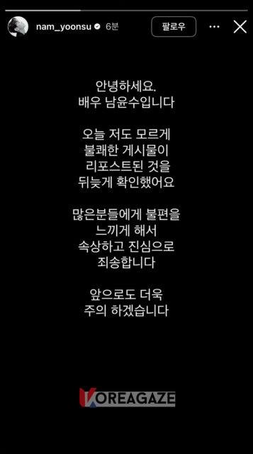 “سلام، من بازیگر نام یون سو هستم. من تازه متوجه شدم که یک پست ناخوشایند بدون اطلاع من از حساب من بازنشر شده است. من از اینکه باعث ناراحتی بسیاری از افراد شدم بسیار ناراحتم و صمیمانه عذرخواهی میکنم. از این به بعد بیشتر دقت خواهم کرد.” – نام از طریق اینستاگرام