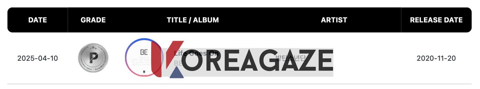 در نهایت، در بخش استریم، آهنگ موفق 2020 گروه BTS به نام “Life Goes On” پس از عبور از 100 میلیون استریم، گواهینامه پلاتینیوم (platinum) دریافت کرد.