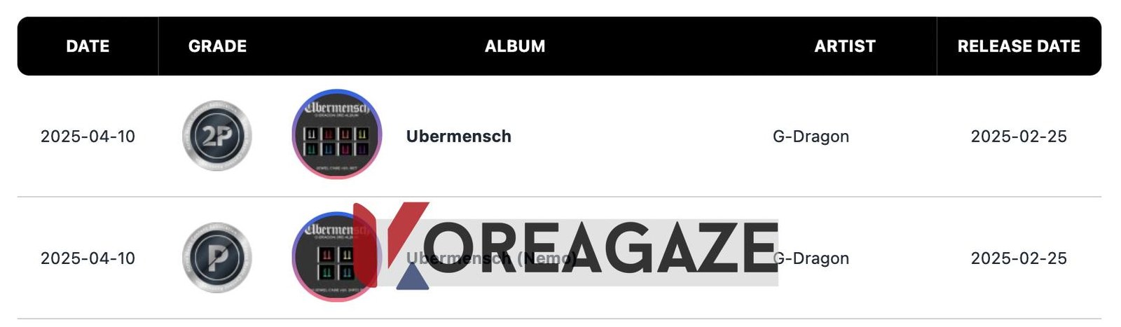 جی دراگون (G-Dragon) از گروه BIGBANG نیز برای آلبوم انفرادی جدید خود به نام “Übermensch” دو گواهینامه جداگانه دریافت کرد. نسخه معمولی این آلبوم برای فروش بیش از 500,000 نسخه، گواهینامه دابل پلاتینیوم (double platinum) دریافت کرد، در حالی که نسخه Nemo برای فروش بیش از 250,000 نسخه، گواهینامه پلاتینیوم (platinum) دریافت کرد.