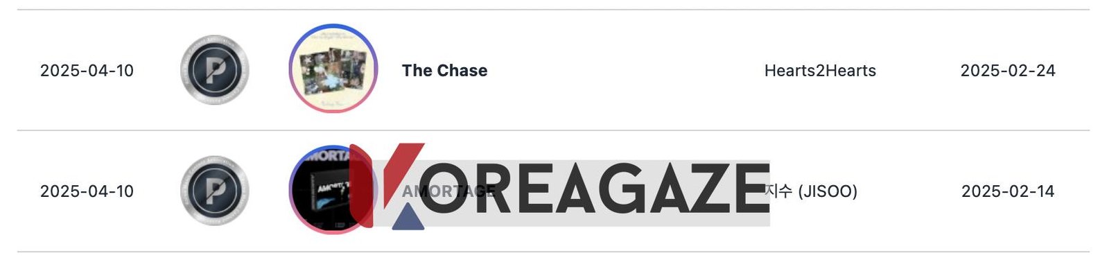 مینی آلبوم انفرادی جیسو (Jisoo) از BLACKPINK به نام “AMORTAGE” و مینی آلبوم دبیو Hearts2Hearts به نام “The Chase” هر دو برای فروش بیش از 250,000 نسخه، گواهینامه پلاتینیوم (platinum) دریافت کردند.