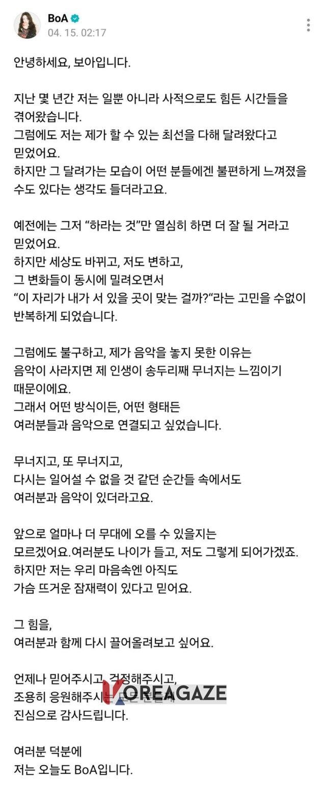 «سلام، این بوا (BoA) هستم. در چند سال گذشته، من در محل کار و زندگی شخصیام دوران سختی را پشت سر گذاشتهام. با این وجود، احساس کردم که تا اینجا آمدهام و تمام تلاشم را کردهام. اما همچنین احساس کردم که دیدن من که تا این حد دویدهام ممکن است برای برخی ناراحتکننده بوده باشد. قبلاً معتقد بودم که اگر فقط سخت روی چیزی که به من گفته شده کار کنم، اوضاع بهتر خواهد شد.