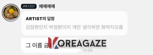 یکی از طرفداران نوشته بود: “هر وقت به اون کیم جونگ هیون یا پارک جونگ هیون یا هر کوفتی که هست فکر میکنم، خیلی عصبانی میشم.” و سئو یه جی در جواب گفته: “این اسم ممنوعه! استرس…”