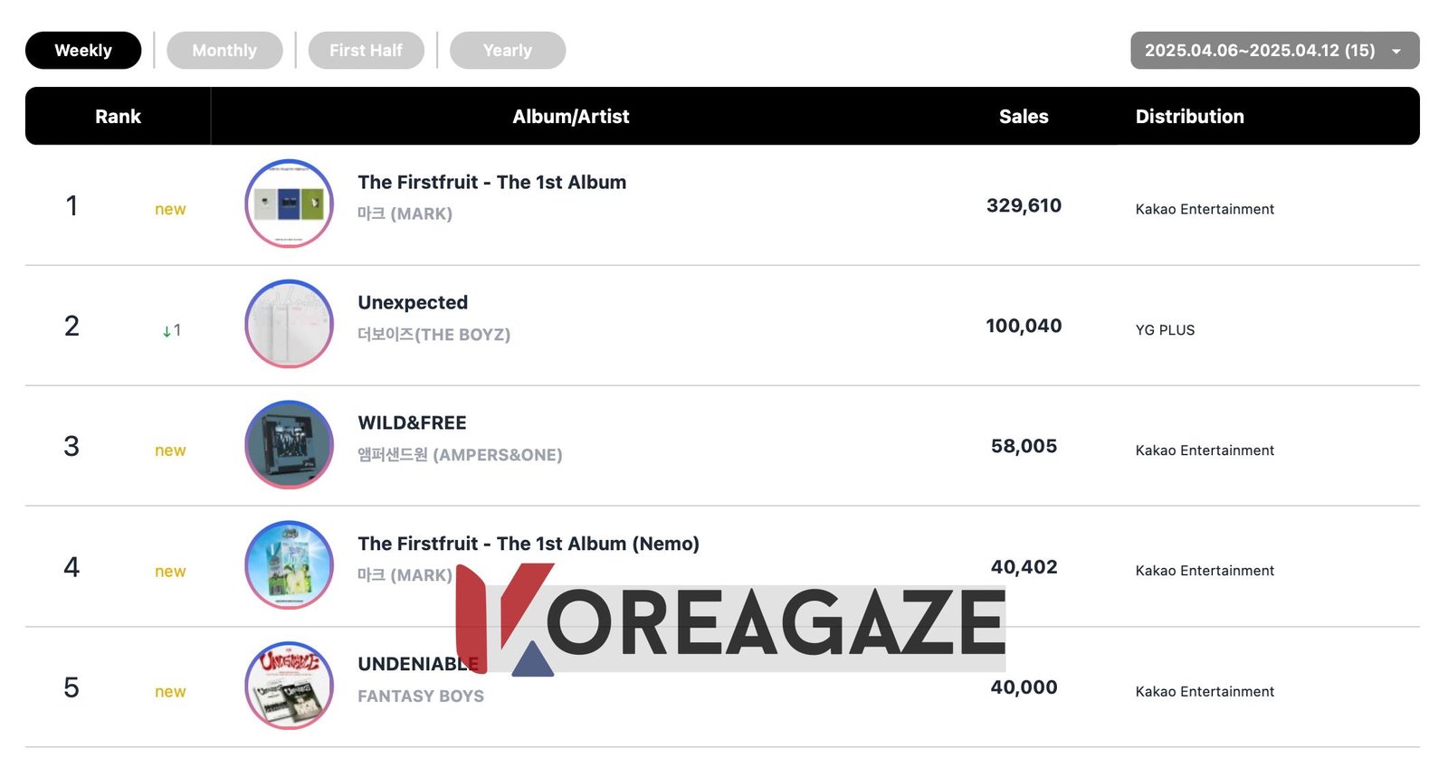 مارک (Mark) با آلبوم “The Firstfruit” دو جایگاه از چهار جایگاه برتر چارت آلبوم این هفته را به خود اختصاص داد: نسخه معمولی آلبوم در رتبه 1 قرار گرفت، در حالی که نسخه Nemo به طور جداگانه در رتبه 4 قرار گرفت.