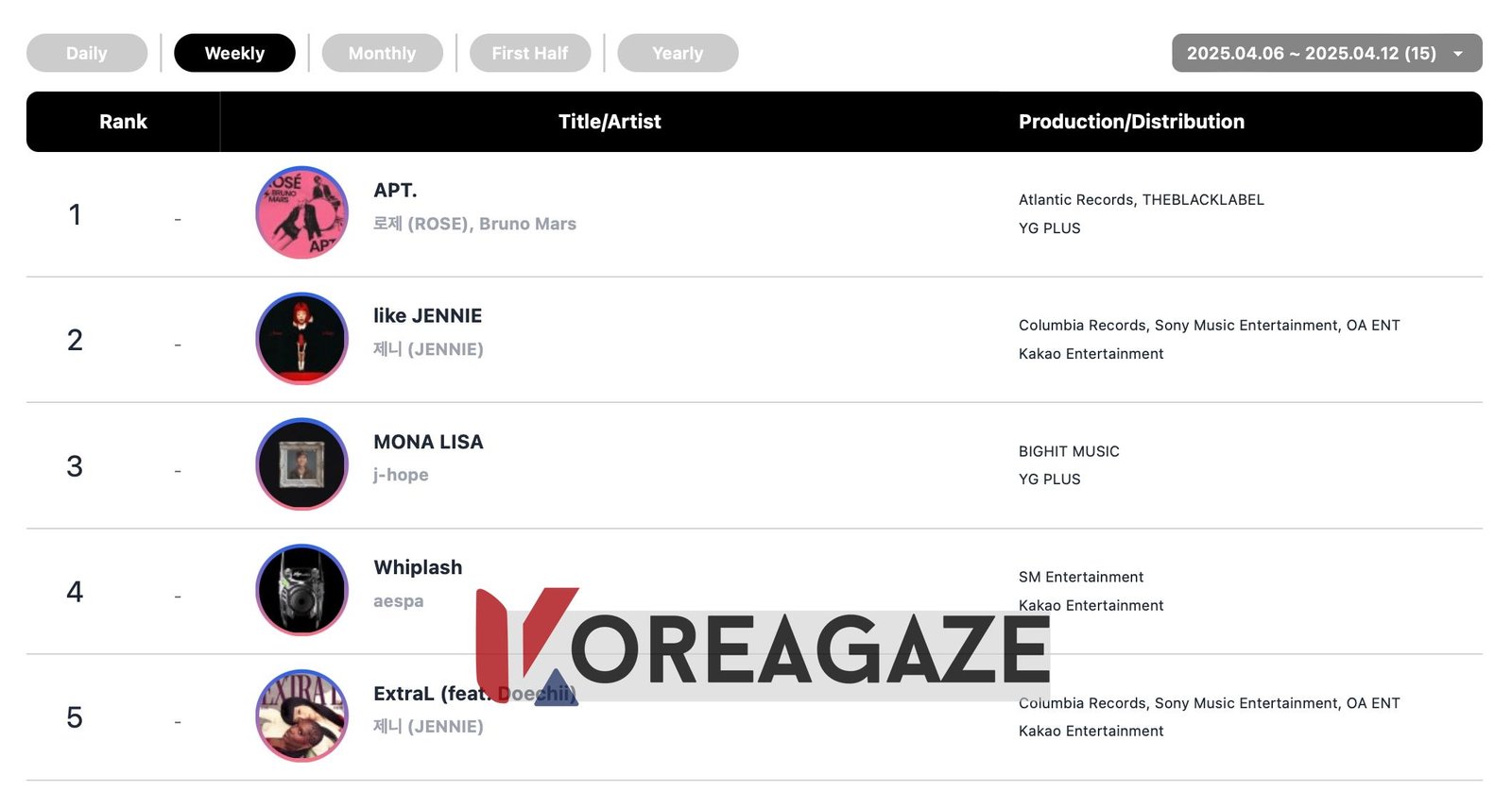 پنج آهنگ برتر چارت استریم این هفته دقیقاً مشابه هفته گذشته باقی ماندند: آهنگ “APT.” از رزی (Rosé) از گروه BLACKPINK و برونو مارس (Bruno Mars) به سلطنت خود در رتبه 1 ادامه داد، و پس از آن آهنگ “like JENNIE” از جنی (Jennie) در رتبه 2، آهنگ “MONA LISA” از جی هوپ (j-hope) از گروه BTS در رتبه 3، آهنگ “Whiplash” از aespa در رتبه 4 و آهنگ “ExtraL” از جنی (Jennie) با حضور Doechii در رتبه 5 قرار گرفتند.