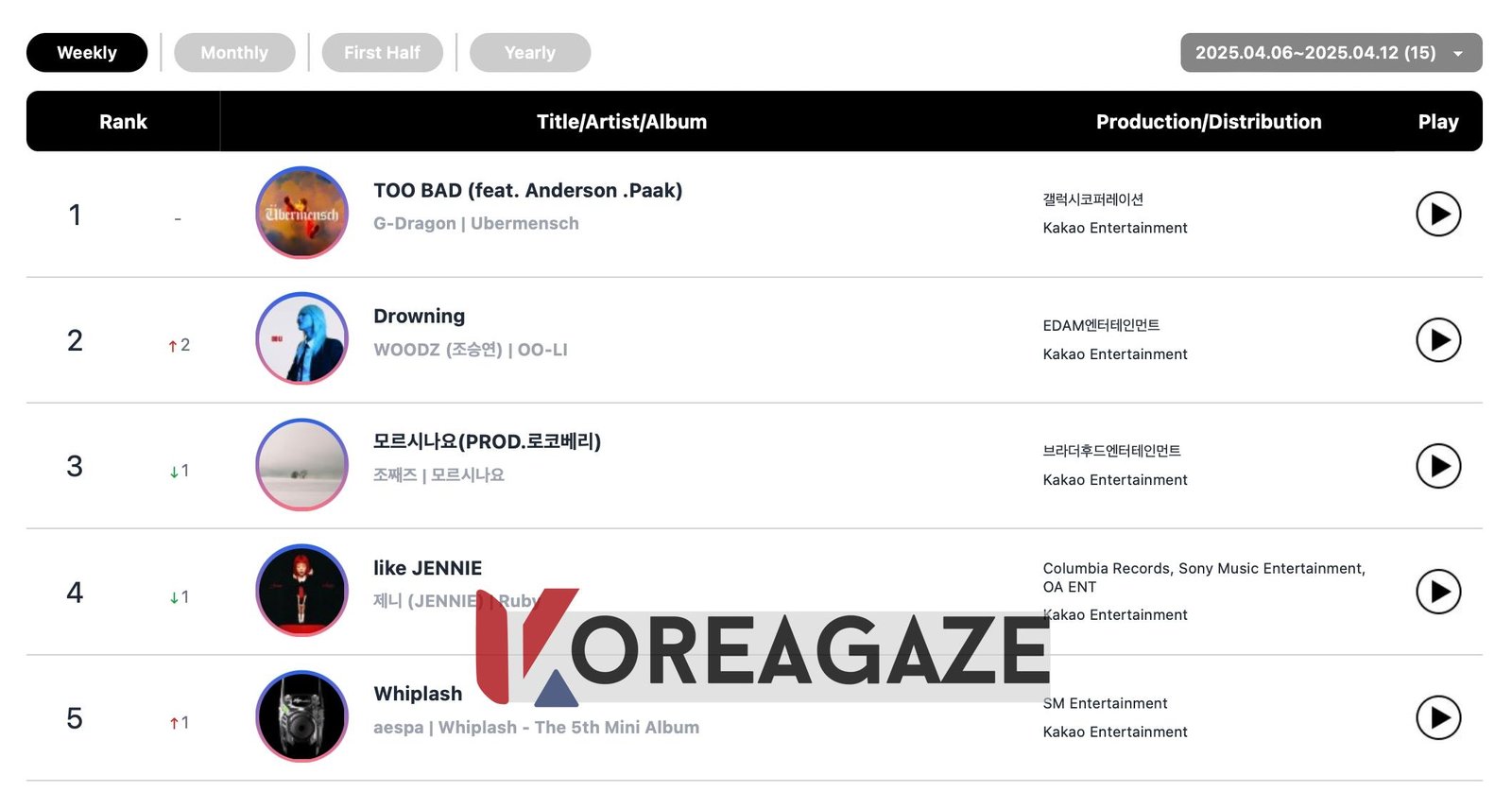 در نهایت، آهنگ “Whiplash” از aespa دوباره به رتبه 5 این هفته صعود کرد.