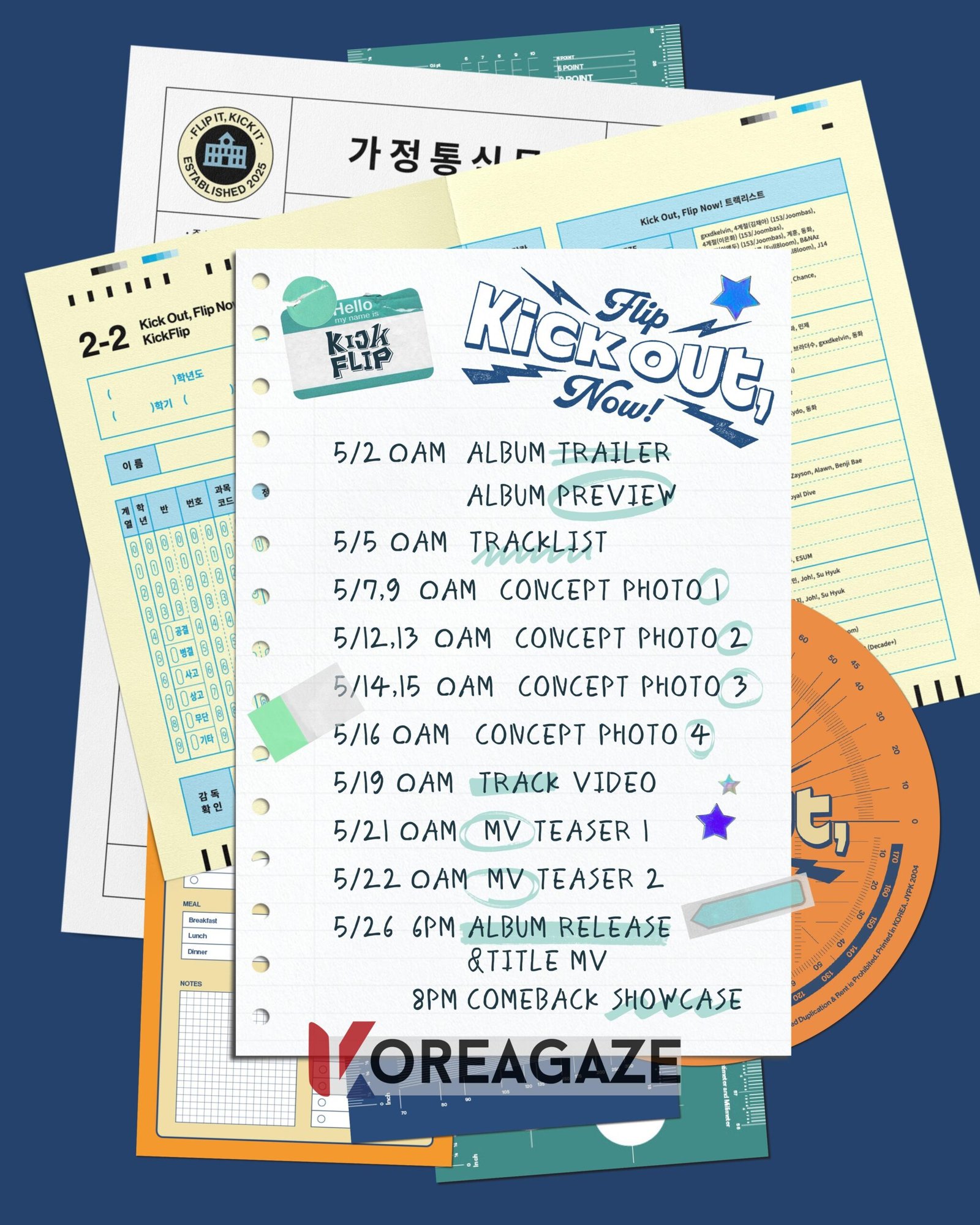 گروه تازهکار کیکفلیپ (KickFlip) در تاریخ 2 می (13 اردیبهشت) ساعت 12 شب به وقت کره جنوبی، اولین تیزرهای (Teaser) دومین مینی آلبوم خودشون به اسم “Kick Out, Flip Now!” رو منتشر کردند. این تیزرها شامل یک برنامه زمانبندی تبلیغاتی مفصل به همراه یک تریلر (Trailer) سرگرمکننده با عنوان “Wanna skip today?” هست.