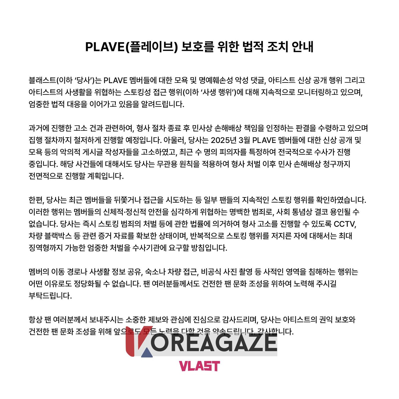 علاوه بر این، اخیراً رفتار مداوم تعقیب و آزار توسط افراد خاصی را تأیید کردهایم که سعی کردهاند اعضای PLAVE (پلیو) را دنبال یا به آنها نزدیک شوند. چنین اقداماتی تهدیدی جدی برای سلامت جسمی و روانی هنرمندان است و به وضوح اعمال مجرمانه است که تحت هیچ شرایطی قابل توجیه نیست. در پاسخ، ما شواهدی از جمله فیلمهای دوربین مداربسته و ضبطهای دوربین داشبورد خودرو را به دست آوردهایم و آمادهایم تا طبق قانون مجازات تعقیب و آزار، اتهامات کیفری را مطرح کنیم. برای متخلفان مکرر، ما به دنبال حداکثر مجازات مجاز قانونی، از جمله حبس احتمالی خواهیم بود.