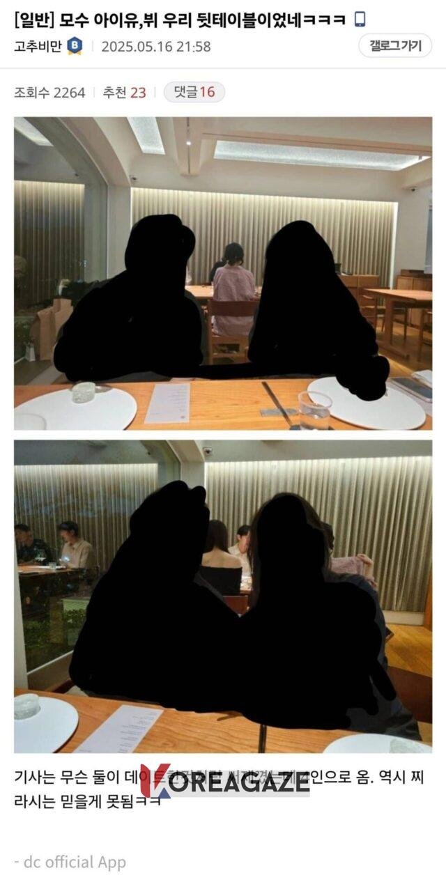 نوشته: IU و V درست پشت میز ما در Musoo بودند. پست: مقالات طوری نوشتهاند که انگار آنها در یک قرار ملاقات بودند، اما آنها به صورت یک گروه 4 نفره آمده بودند. همانطور که انتظار میرفت، نمیتوان به مجلات شایعات اعتماد کرد. — پست بالا