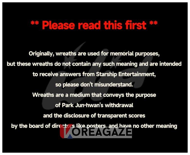 طرفداران با انتشار اطلاعیههایی به زبان انگلیسی و کرهای، کمکهای مالی برای تاج گلهای عزا را برای قرار دادن در مقابل استارشیپ اینترتینمنت جمعآوری کردهاند. در این اطلاعیه به طور خاص ذکر شده است که هدف از این تاج گلها جلب توجه به خواستههای مربوط به خروج او است و نه آرزوی مرگ.