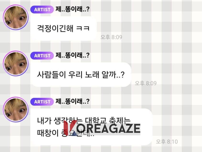 جنو (Jeno) گفت: “یکم نگرانم هاها. اصلا مردم آهنگهای ما رو میشناسن…؟ وقتی به یه جشنواره دانشگاهی فکر میکنم، همخوانی جمعیت مهمترین بخششه…”