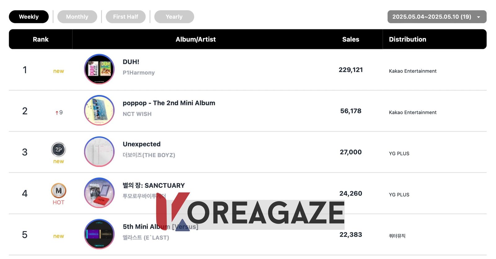 گروه P1Harmony با مینی آلبوم جدید خود به نام “DUH!” در صدر چارت آلبوم فیزیکی این هفته قرار گرفت و در جایگاه اول شروع به کار کرد.