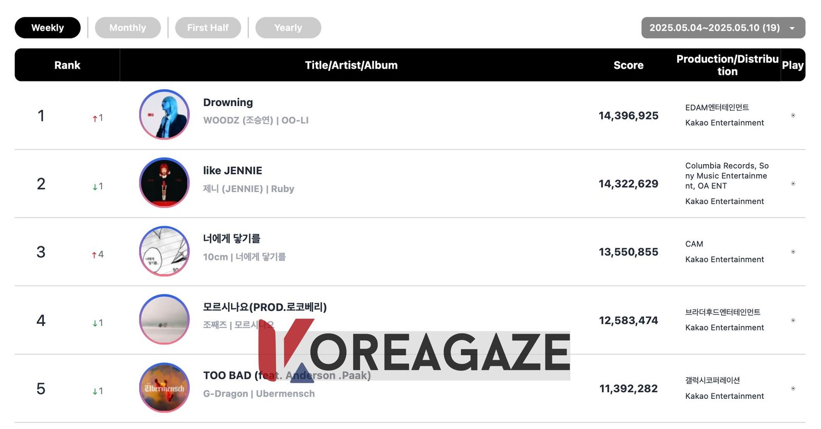 دو سال پس از انتشار، آهنگ “Drowning” از WOODZ (چو سونگ یون (Cho Seung Youn))، هنرمند سال 2023، در چارتهای Circle این هفته به یک تاج دوتایی دست یافت و در صدر چارت دیجیتال کلی و چارت استریم قرار گرفت.