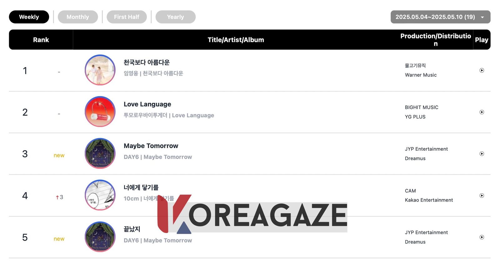 تکآهنگ اخیر TXT با نام “Love Language” در رتبه 2 ثابت ماند، در حالی که DAY6 دو جایگاه در پنج رتبه برتر این هفته به خود اختصاص داد: تکآهنگ جدید آنها “Maybe Tomorrow” در رتبه 3 شروع به کار کرد، در حالی که “game over” در رتبه 5 وارد چارت شد.