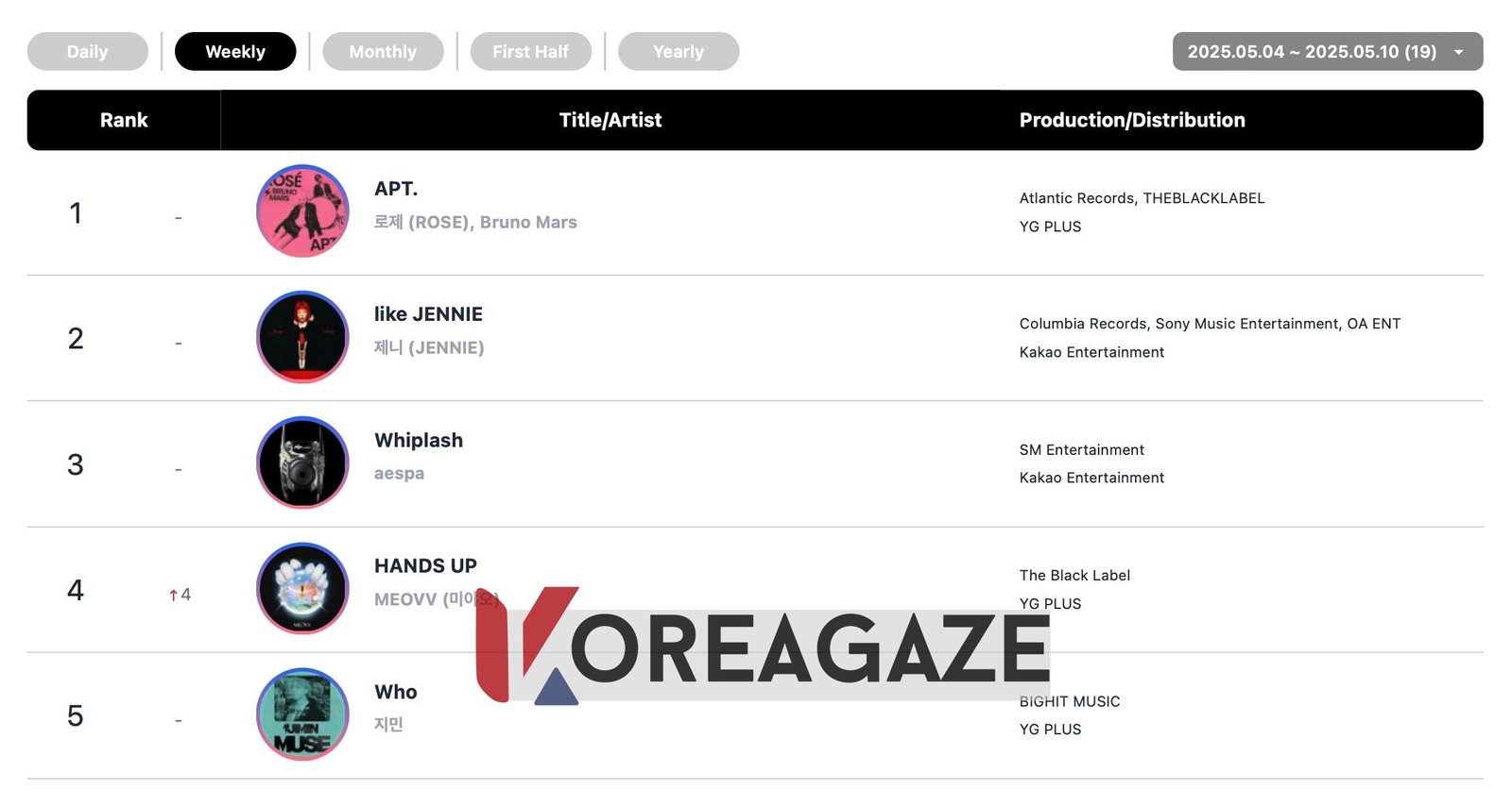 آهنگ “HANDS UP” از MEOVV به رتبه 4 در چارت این هفته صعود کرد و آهنگ “Who” از جیمین (Jimin) (از BTS) پنج رتبه برتر را تکمیل کرد.