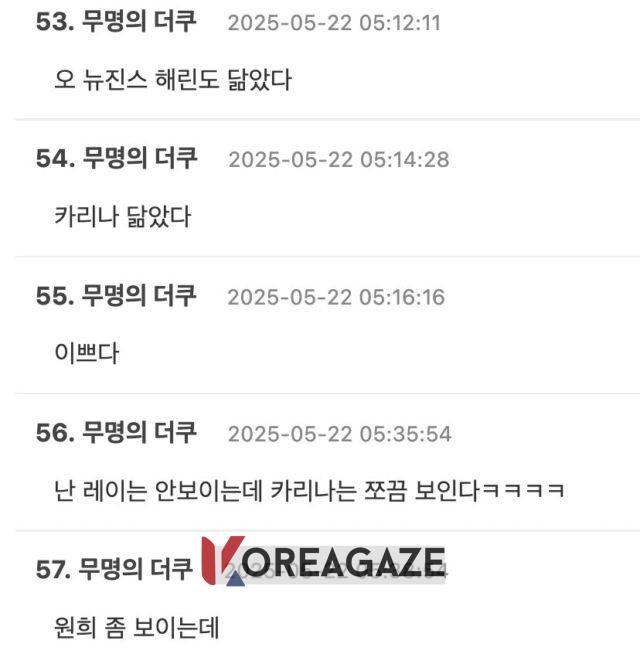 وقتی این موضوع در theqoo مطرح شد، پستی درباره شباهت او، فوراً به بخش موضوعات داغ راه یافت. سایر کاربران اینترنتی نیز نظرات خود را بیان کردند و برخی آیدلهایی مانند ههرین (Haerin) از گروه NJZ (که قبلاً با نام NewJeans شناخته میشد)، وونهی (Wonhee) از گروه ILLIT و غیره را نیز مثال زدند.