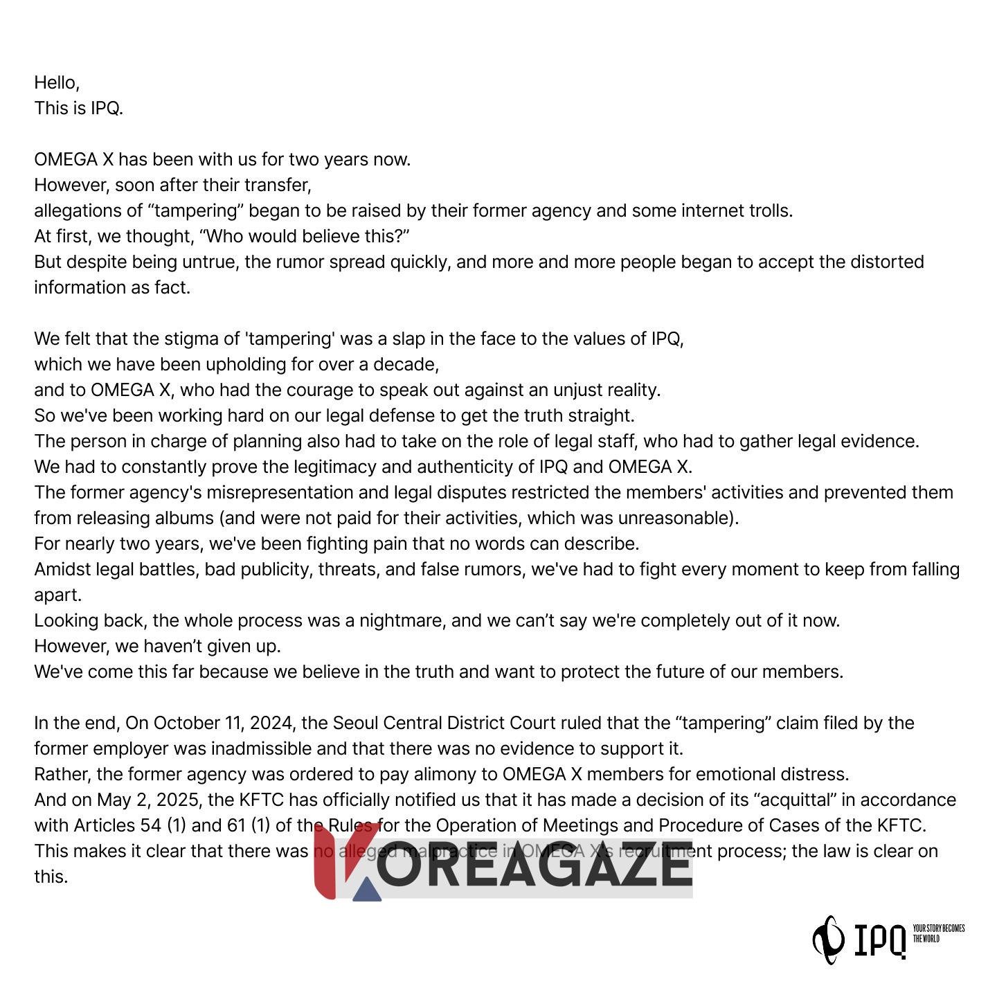 پس از انتشار این خبر، آژانس OMEGA X (امگا ایکس)، یعنی IPQ (آی پی کیو)، بیانیه رسمی منتشر کرد و همچنین فاش کرد که اتهامات “دستکاری” که توسط SPIRE (اسپایر) مطرح شده بود، رسماً تبرئه شده است.