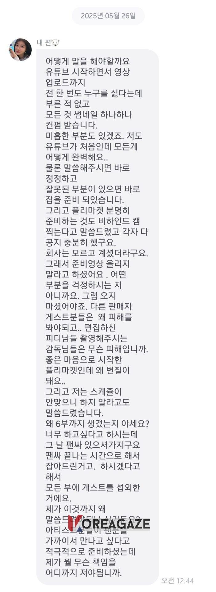 “چطوری بگم؟ از وقتی که کانال یوتیوبم رو شروع کردم، حتی یک بار هم کسی رو به برنامهام دعوت نکردم که تمایلی به حضور نداشته باشه—هر چیزی، از جمله عکس بندانگشتی (thumbnail)، قبل از آپلود تایید میشه. البته، هنوز هم بخشهایی وجود خواهند داشت که کم و کاستی دارن. این اولین باره که یوتیوب انجام میدم، چطوری میتونم در همه چیز بینقص باشم؟ با این حال، من همیشه آمادهام چیزهایی که اشتباه هستند رو اصلاح کنم. من قبلاً اعلام کرده بودم که یک فیلم پشت صحنه برای آمادهسازیهای بازارچه خیریه وجود خواهد داشت. اما به نظر میرسید که کمپانی از اون خبر نداشته. بنابراین اونا به من گفتن که اون رو منتشر نکنم. چون من میدونم اونا نگران چه بخشی هستن. اما خب نباید میاومدین. چرا بقیه فروشندهها باید خسارت ببینن… و تهیهکننده و کارگردانی که اون رو ویرایش و فیلمبرداری کردن؟ چرا این بازارچه خیریه، که برای یک هدف خوب شروع شده بود، باید اینطوری آسیب ببینه؟ و من به گروه گفتم که لازم نیست این کار رو انجام بدن چون برنامههاشون با هم جور نیست. میدونید چرا این ماجرا شش قسمت شد؟ چون خودشون میخواستن این کار رو انجام بدن. اون روز یه مراسم امضای طرفدار داشتن و خواستن که بعد از مراسم فیلمبرداری بشه، بنابراین ما برنامه فیلمبرداری رو براشون تغییر دادیم. و از اونجایی که خیلی دلشون میخواست این کار رو انجام بدن، ما برای هر قسمت مهمون جذب کردیم. میدونید چرا من اصلاً دارم اینا رو بهتون میگم؟ هنرمندا خیلی سخت برای این کار آماده شدن چون میخواستن طرفداراشون رو از نزدیک ملاقات کنن، و من نمیدونم که قراره چقدر از این تقصیرها رو به گردن بگیرم.” — لی چه یون