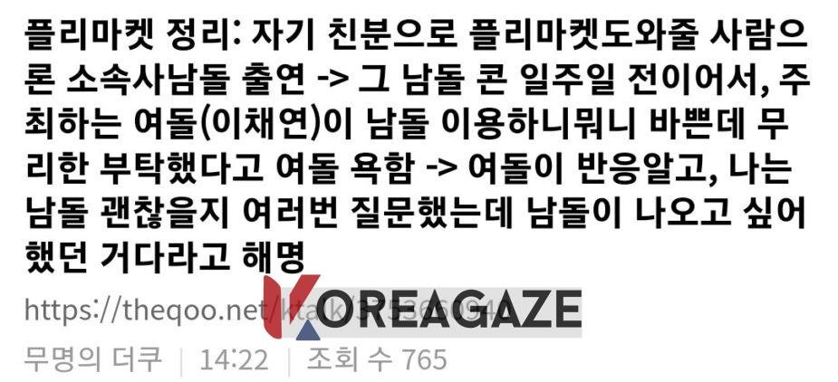 برای اینکه یه کم پسزمینه ماجرا رو بدونید، لی چه یون در حالی که داشت برای یک بازارچه خیریه آماده میشد، یک گروه آیدل مرد از کمپانی خودش رو دعوت کرد تا بیان. اما، طرفداران گروه آیدل مرد، او رو به خاطر استفاده از اونها در حالی که کنسرتشون فقط یک هفته دیگه بود، مورد انتقاد قرار دادند. در پاسخ به این انتقادها، لی چه یون اظهار داشت که او چندین بار ازشون پرسیده که آیا اومدنشون مشکلی نداره، و گروه پاسخ داده که مشکلی نیست.