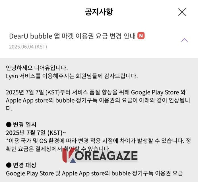 در این پیام اعلام شده بود که قیمت اشتراک Bubble از 7 جولای 2025 (16 تیر 1404) افزایش خواهد یافت.
