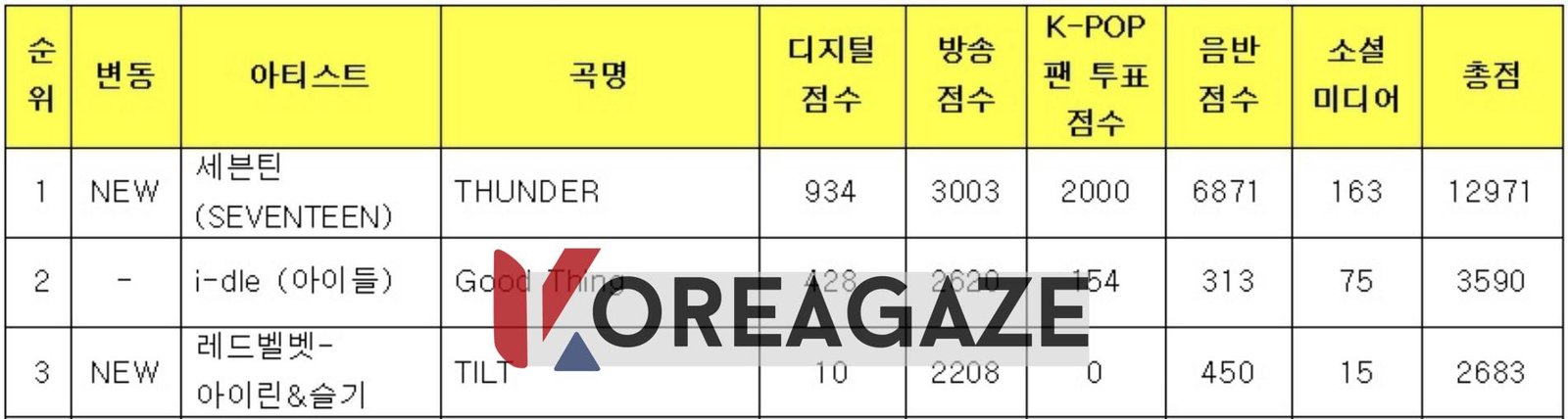 گروه سونتین (SEVENTEEN) با آهنگ “تندر” (THUNDER) سومین برد خود را به دست آورد. این آهنگ در چارت K-Chart بانک موسیقی از 26 می (6 خرداد) تا 1 ژوئن (12 خرداد) در مجموع 12,971 امتیاز کسب کرد.