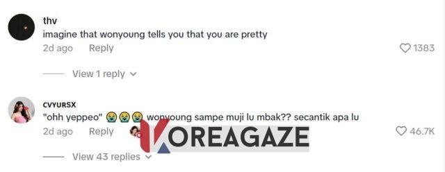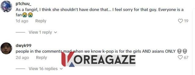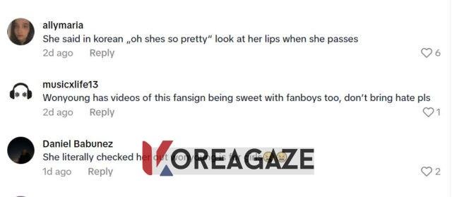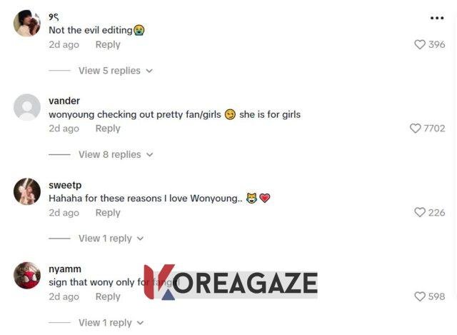 با این حال، یک TikTok هم توجه زیادی را به خود جلب کرد، اما به نظر میرسد واکنشهای متفاوتی را برانگیخت، زیرا OP (شخصی که پست را منتشر کرده) روایتی از واکنش وونیونگ به یک فن مرد در مقایسه با یک فن زن ارائه داد.