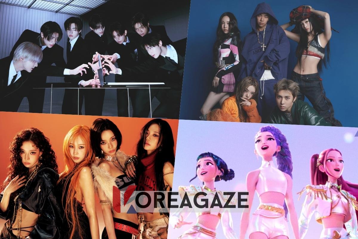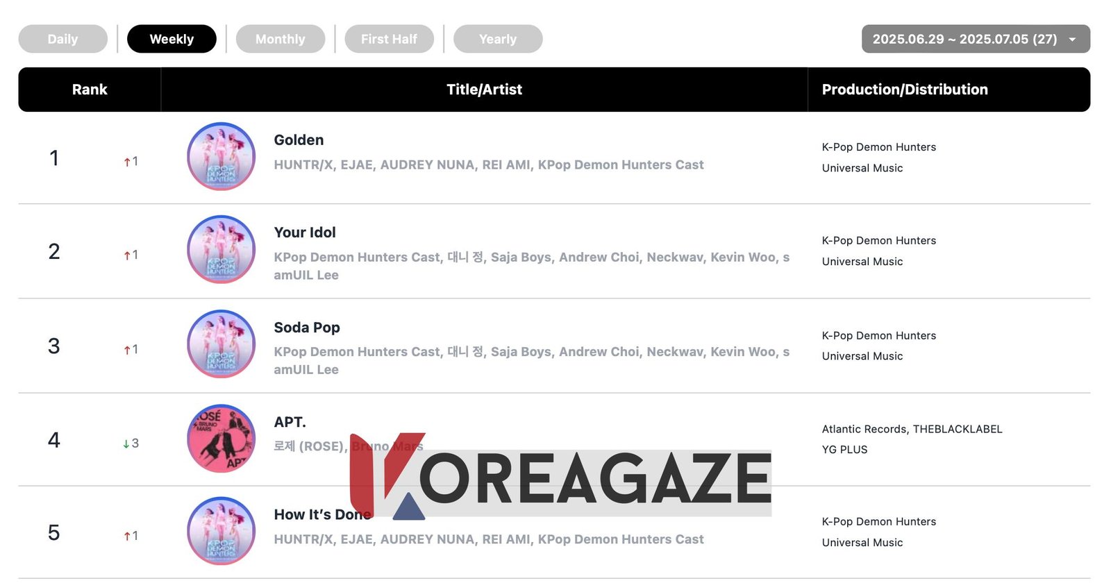 The “KPop Demon Hunters” soundtrack dominated this week’s global K-pop chart, sweeping four out of the top five spots. HUNTR/X’s “Golden” rose to No. 1, Saja Boys’ “Your Idol” (sung by Andrew Choi, Neckwav, Danny Chung, U-KISS’s Kevin Woo, and samUIL Lee) to No. 2, Saja Boys’ “Soda Pop” to No. 3, and HUNTR/X’s “How It’s Done” to No. 5.