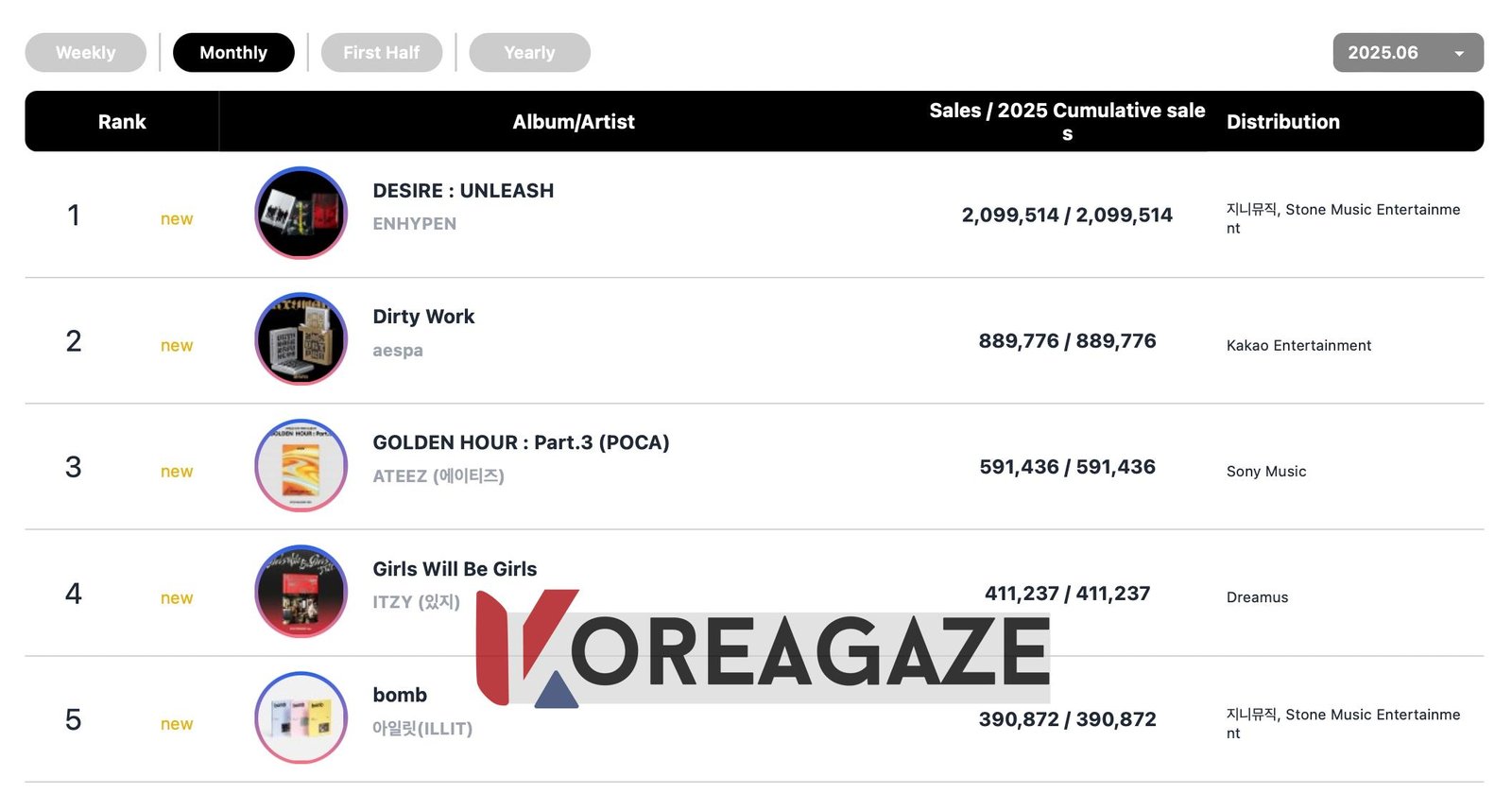 ENHYPEN topped the physical album chart for the month of June with their new mini album “DESIRE : UNLEASH,” which debuted at No. 1.