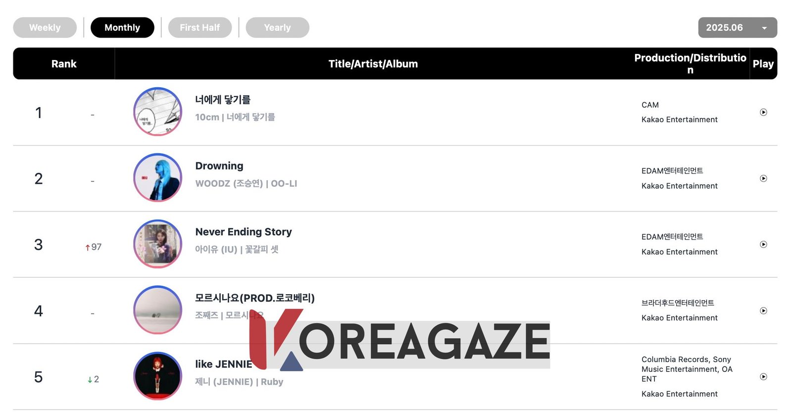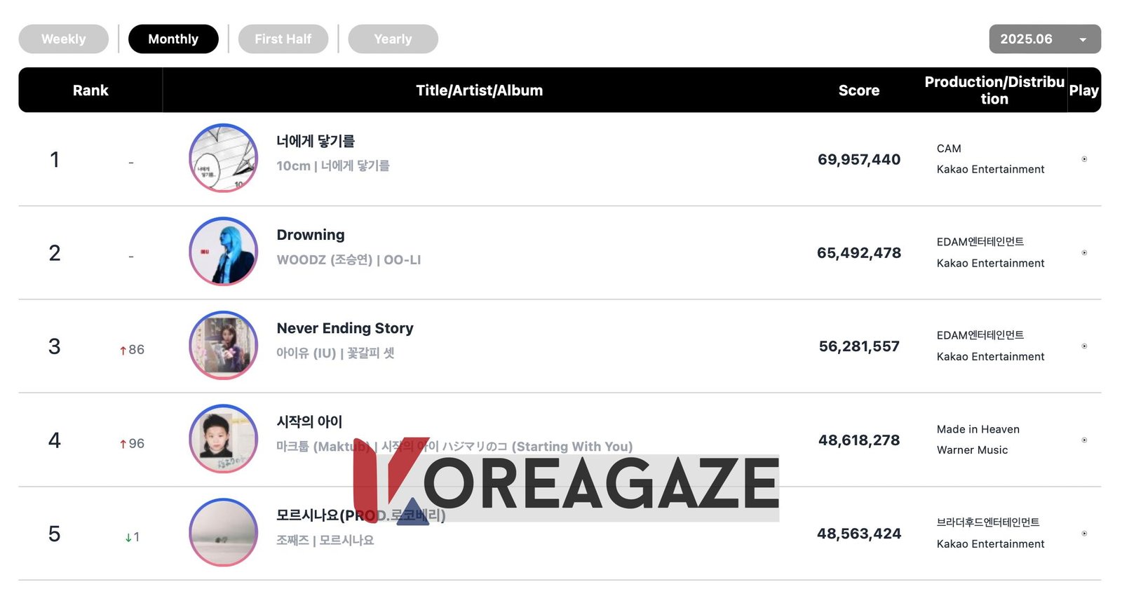The top three songs on the streaming chart for June were exactly the same as the overall digital chart: 10CM’s “To Reach You” came in at No. 1, WOODZ’s “Drowning” at No. 2, and IU’s “Never Ending Story” at No. 3.