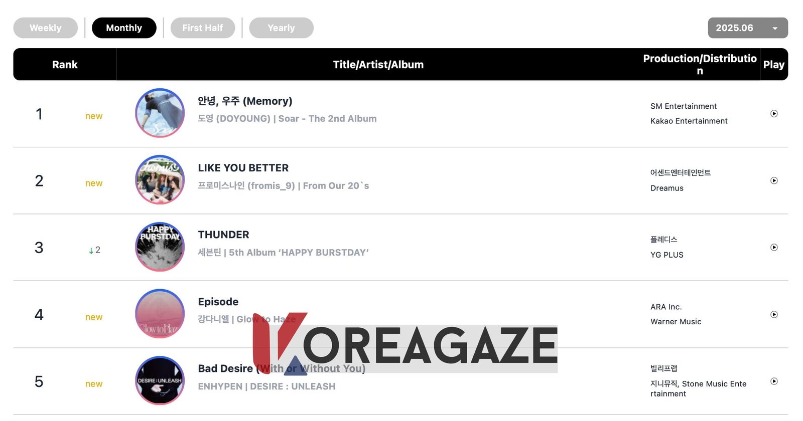 ZO ZAZZ’s “Don’t you know” maintained its position at No. 4 on the monthly chart, and BLACKPINK’s Jennie’s “like JENNIE” rounded out the top five for June.