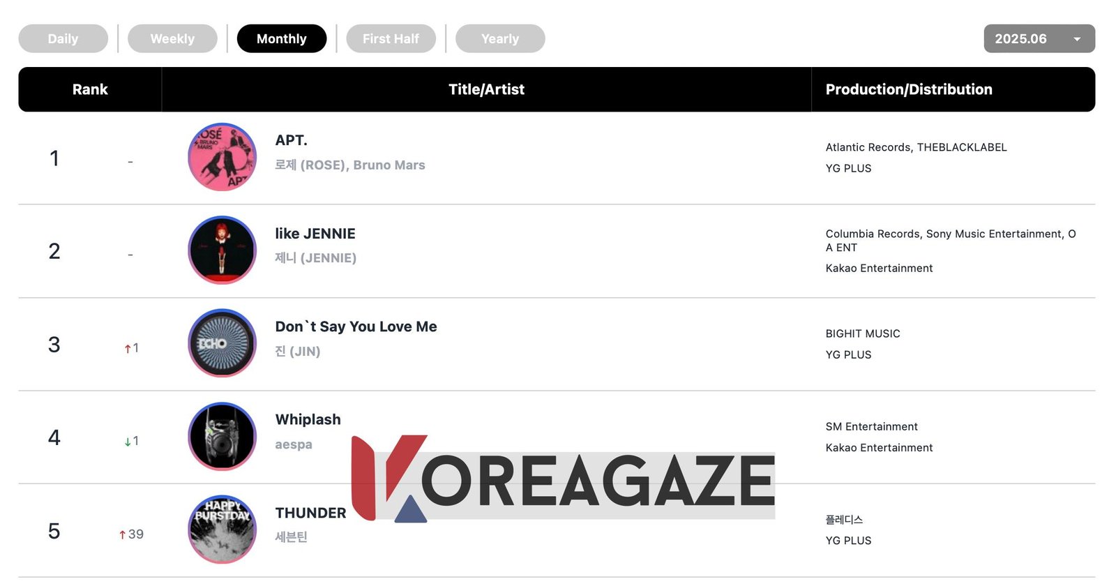 BLACKPINK’s Rosé and Bruno Mars’ “APT. ” continued its reign at No. 1 on the global K-pop chart for June, while Jennie’s “like JENNIE” held onto its spot at No. 2.