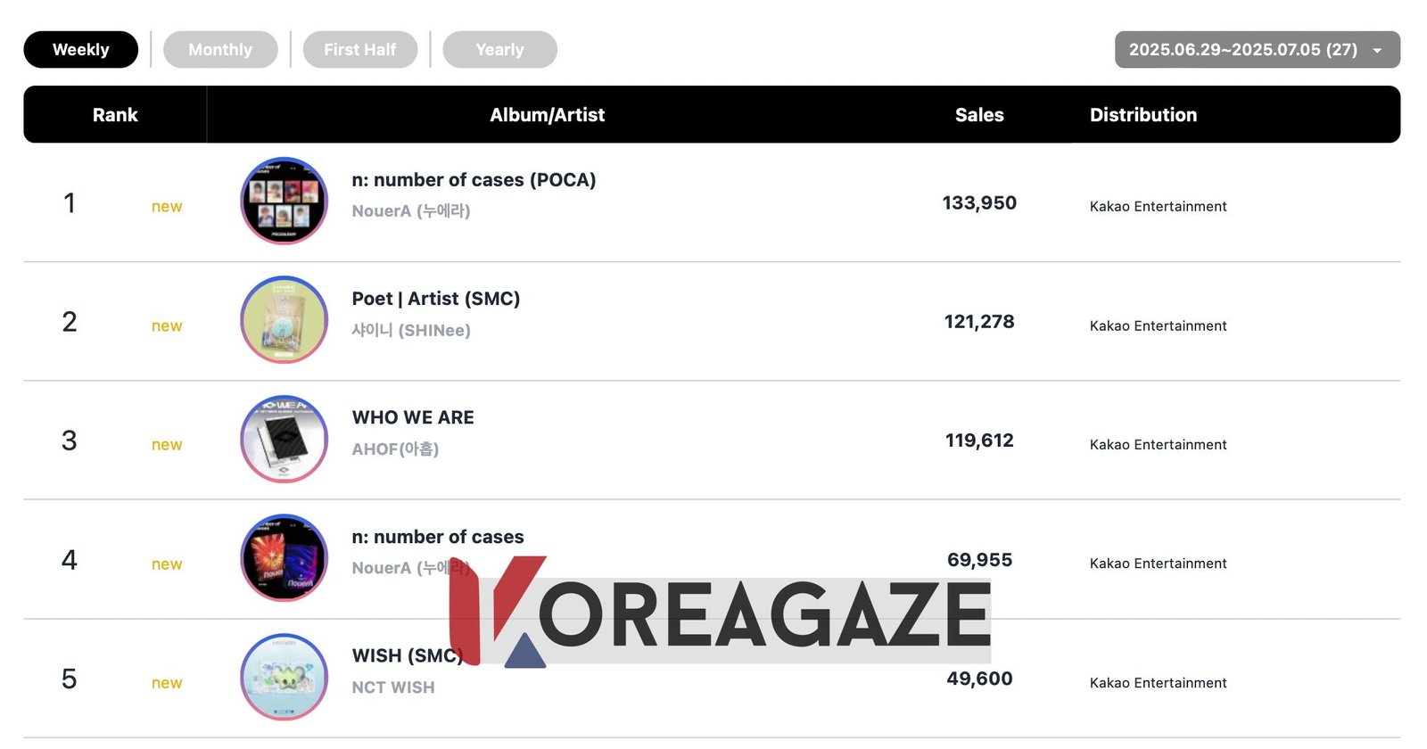NouerA claimed two of the top four spots on the weekly physical album chart with their new mini album “n: number of cases. ” The POCA version of the mini album debuted at No. 1, while the regular version charted separately at No. 4.