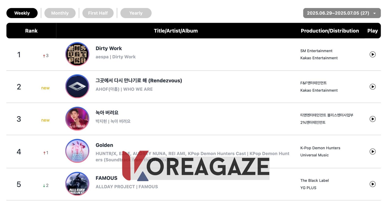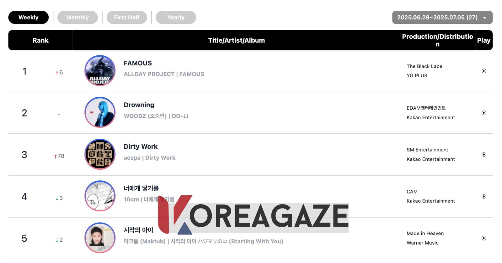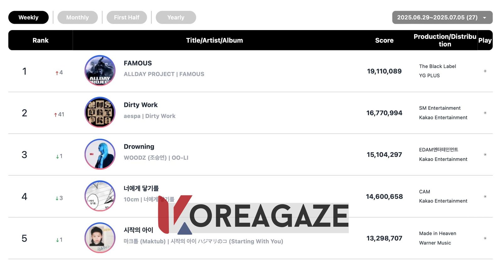 aespa’s new single “Dirty Work” shot to No. 2 on the overall digital chart, followed by WOODZ’s “Drowning” at No. 3, 10CM’s “To Reach You” at No. 4, and Maktub’s “Starting With You” at No. 5.