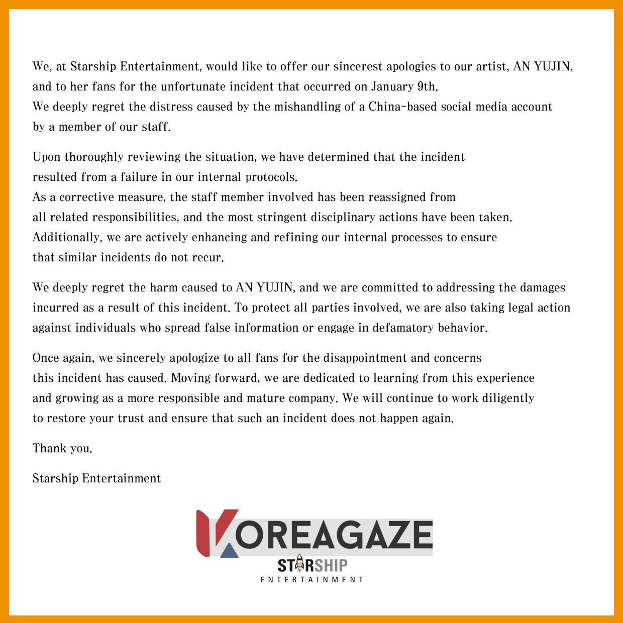 کمپانی استارشیپ اینترتینمنت (Starship Entertainment)، پس از واکنش منفی طرفداران نسبت به بازنشر محتوای دیپ فیک در حساب رسمی ویبو (Weibo) چین، عذرخواهی رسمی کرد.