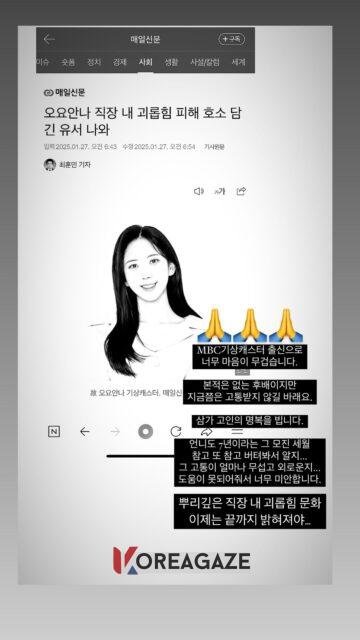 این موضوع به عنوان یک گزارشگر آب و هوای سابق MBC، واقعاً برایم سنگین است. من هرگز فرصت ملاقات با این همکار جوانترم را پیدا نکردم، اما امیدوارم دیگر دردی نکشد. روحش شاد. من هم هفت سال تجربههای آزاردهندهای را تحمل کردهام… میدانم چقدر میتواند ترسناک، تنها و دردناک باشد. متاسفم که نتوانستم کمکی به تو بکنم. فرهنگ قلدری ریشهدار در محیط کار واقعاً باید با یک تحقیق کامل به پایان برسد. – پارک اون جی