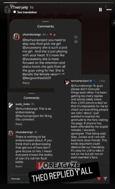 او توضیح داد که تعداد زیادی کامنت، استوری و پیام دریافت می کند و دیدن همه چیزهایی که گفته می شود “غیرممکن” است. او بابت رفتارش عذرخواهی کرد و اضافه کرد که همچنان با سی آن (Si An) و یوک جون سو (Yuk Jun Seo) دوست صمیمی است. او همچنین گفت که این بحث و جدل ها می تواند به این دوستی آسیب بزند و نباید خشم خود را سر دیگران خالی کرد.